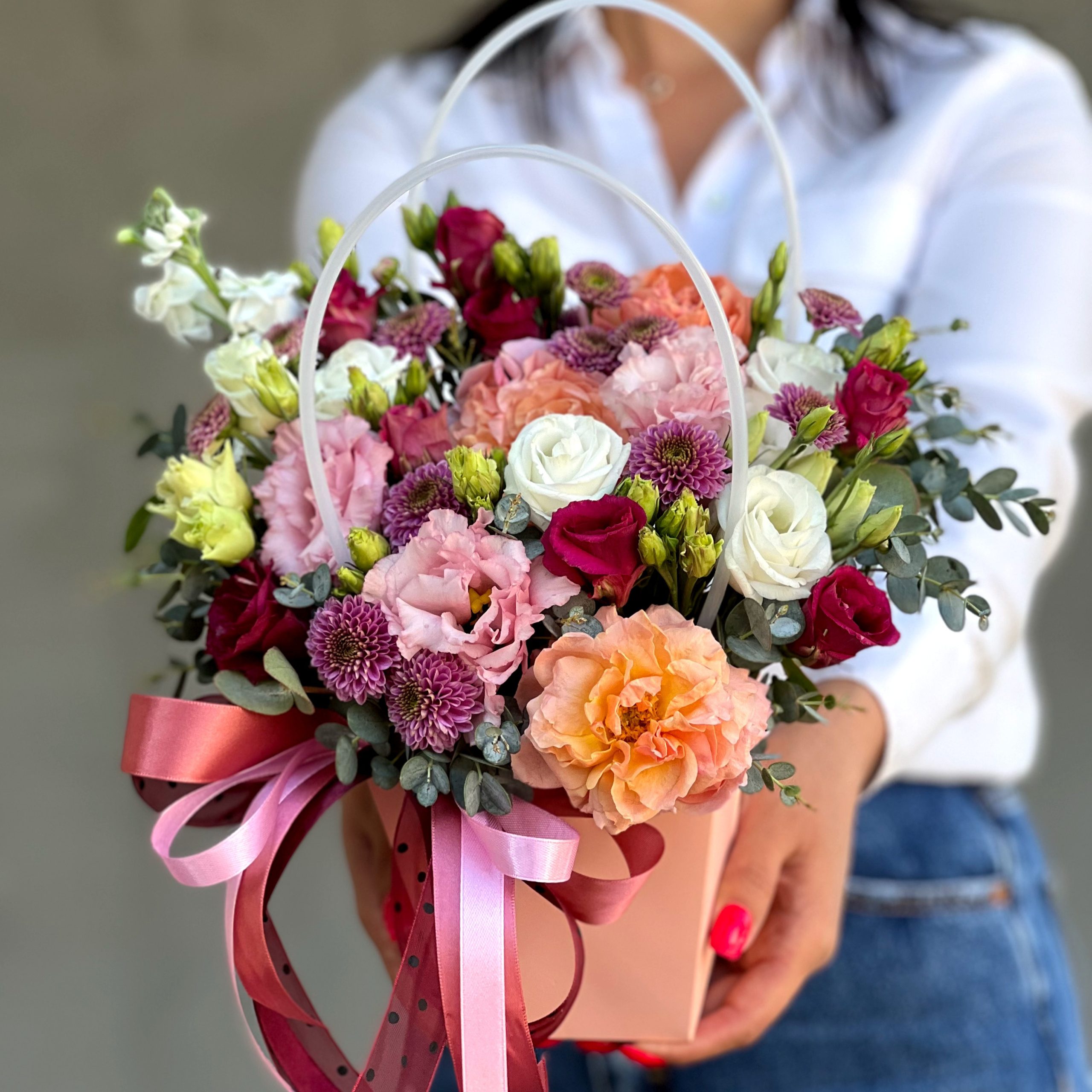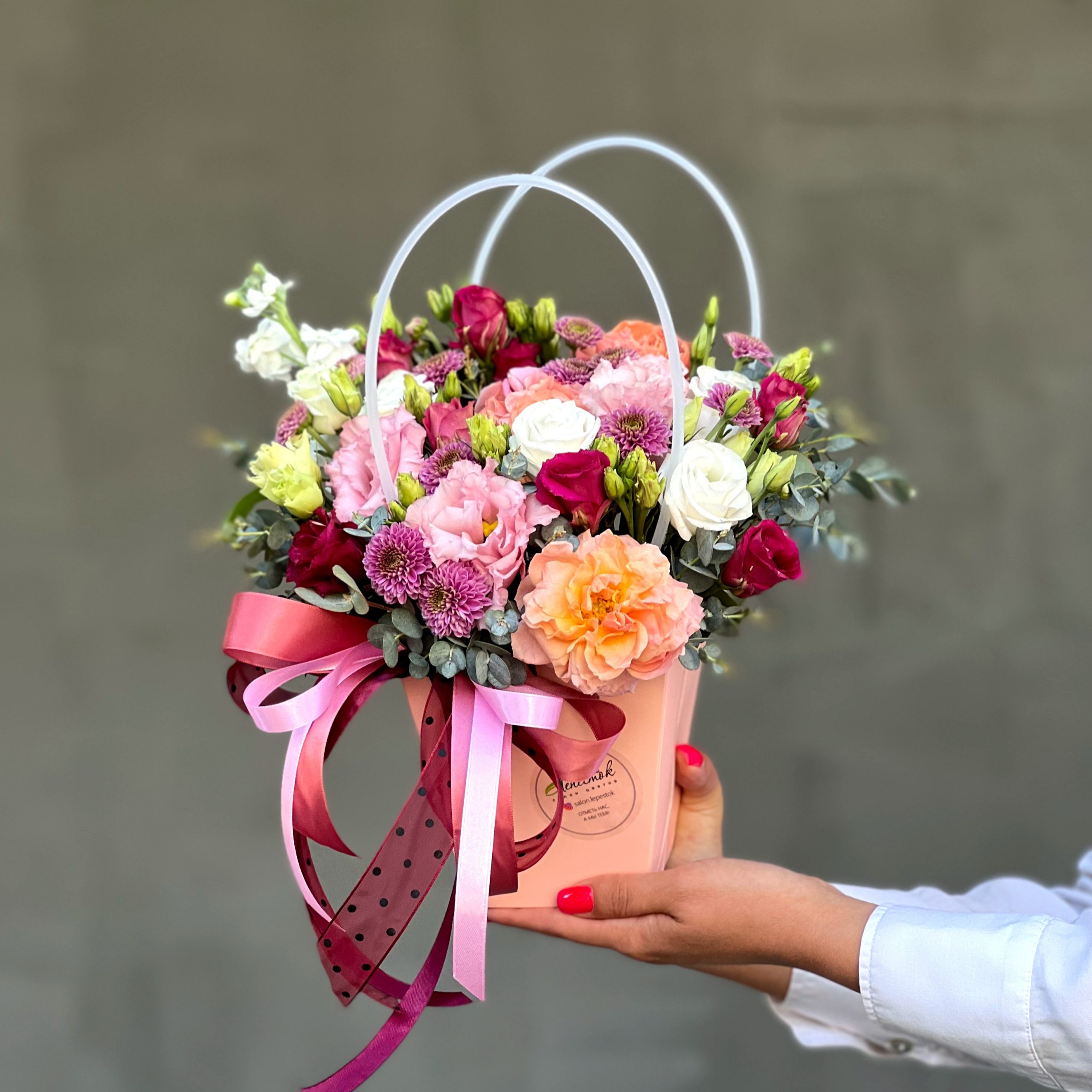 Сумочка из лизиантусов, маттиолы и пионовидной розы в Лангепасе