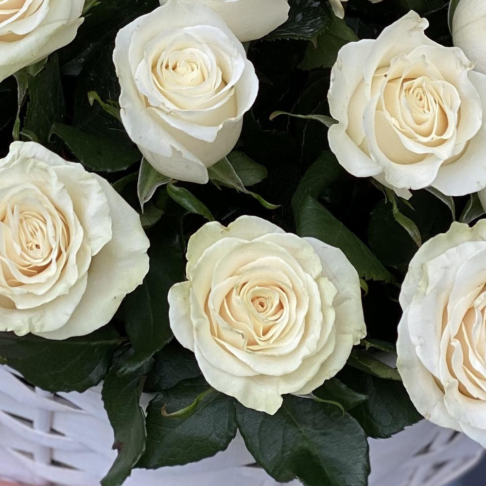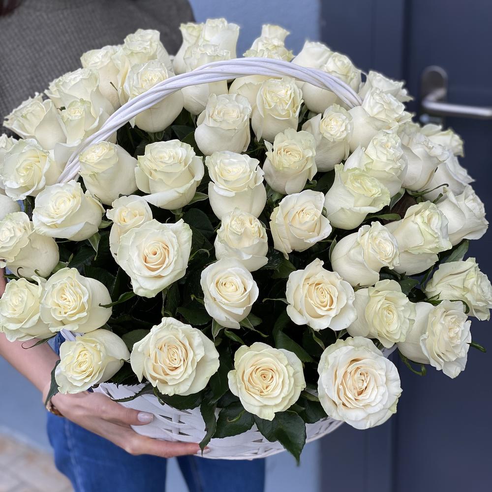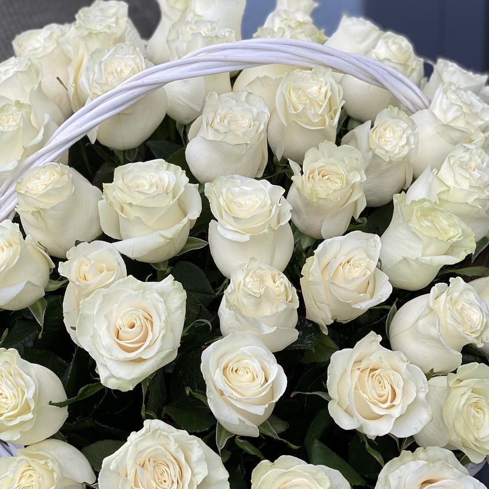 Эта изысканная корзина представляет собой великолепную россыпь из 65 белоснежных роз. Каждый цветок излучает свою нежность и красоту, создавая впечатление пленительного облака свежести и элегантности. Этот букет наполнит пространство благородством и изяществом.